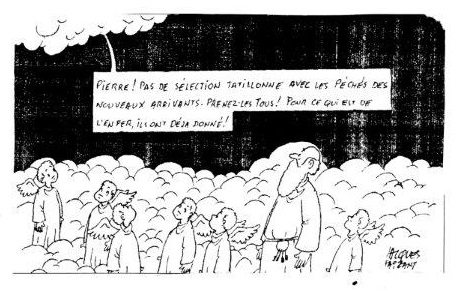 légende du dessin :Pierre ! Pas de sélection tatillonne avec les péchés des nouveaux arrivants .Prenez les tous ! Pour ce qui est de l’enfer, ils ont déjà donné!