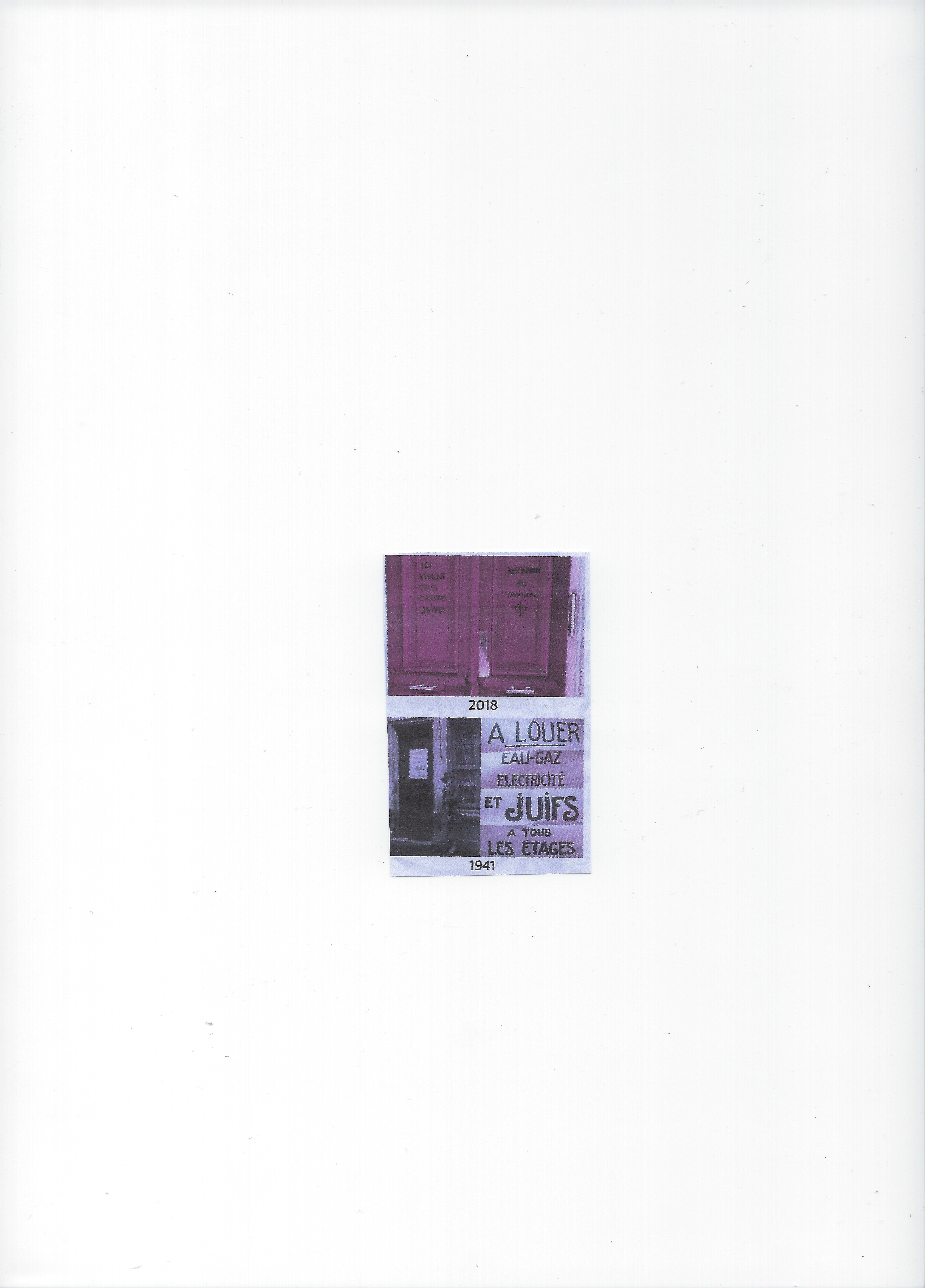 Dans les archives de la préfecture de police, on trouve cette photo presque identique, datant de 1941, de la porte d’un immeuble du 18e arrondissement, recouverte de cette affichette : « A louer eau-gaz électricité et JUIFS à tous les étages. »