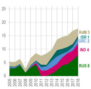 Graphique 1 : géographie des importations pétrolières de la Turquie (2005-2018). Calculs de Deniz Ünal à partir de EPDK (2007, 2018a, 2019a).