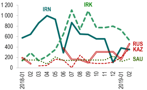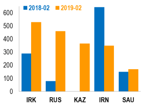 Notes: les pays fournisseurs sont indiqués par leurs codes ISO: KAZ ( Kazakhstan) IRK (irak), IRN (iran), RUS (russie), SAU (arabie saoudite). Les achats en provenance de ces cinq pays représentent 80% des importations totales de brut par la Turquie en Février 2019