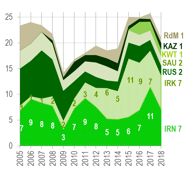 Graphique 1 : géographie des importations pétrolières de la Turquie (2005-2018). Calculs de Deniz Ünal à partir de EPDK (2007, 2018a, 2019a).