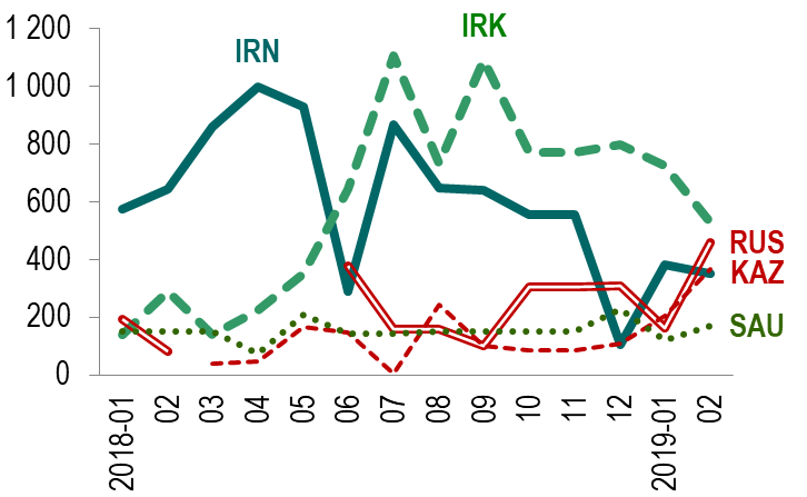 Graphique 2 : importations turques de pétrole brut : principaux fournisseurs – janvier 2018 – février 2019 (milliers de tonnes). calculs de Deniz Ünal à partir de EPDK (Autorité nationale de régulation du marché de l’énergie, 2019a).