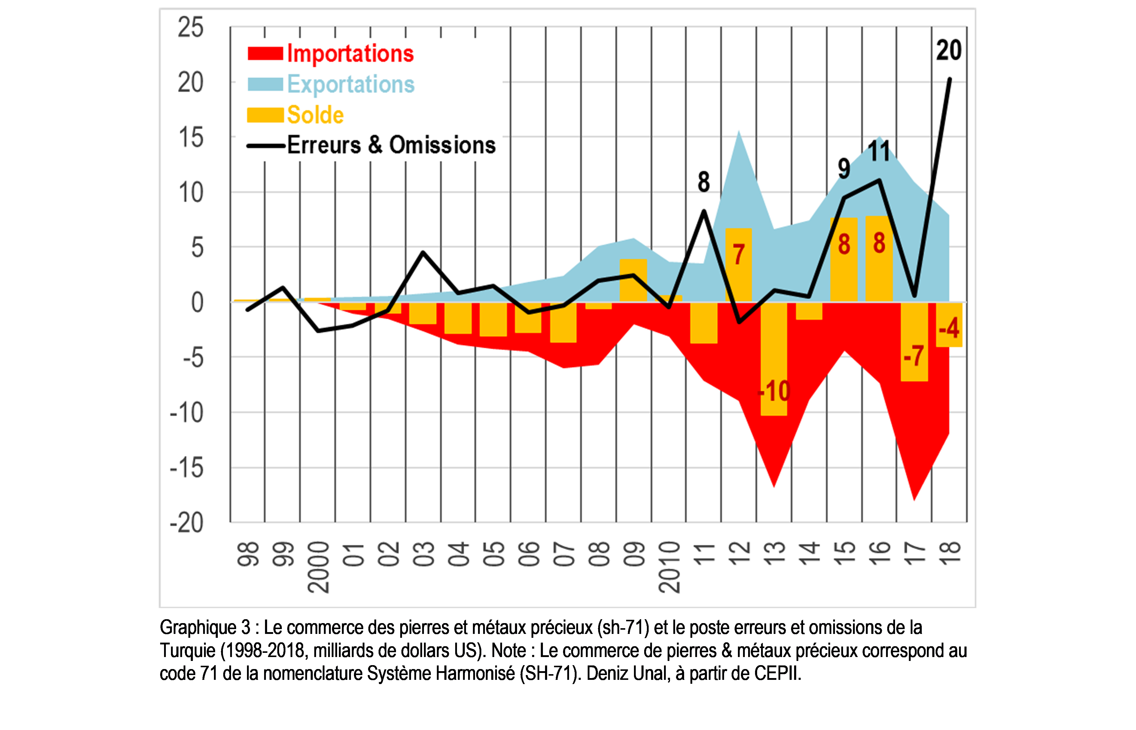 Le graphique 3 porte sur le commerce durant ces 20 dernières années entre la Turquie et tous ses partenaires dans le grand poste « pierres et métaux précieux » qui comprend tant l’or non monétaire que les bijoux en or. Il porte aussi sur les « erreurs et omissions » de la balance des paiements, poste où sont enregistrés les erreurs ou arrondissements dans la comptabilisation des échanges avec les non-résidents, ainsi que des décalages de paiements entre flux commerciaux et financiers. (C’est U?ur Gürses, ancien économiste à la banque centrale turque et chroniqueur réputé, qui a présenté pour la première fois ce type de graphique (2013) dans la presse).