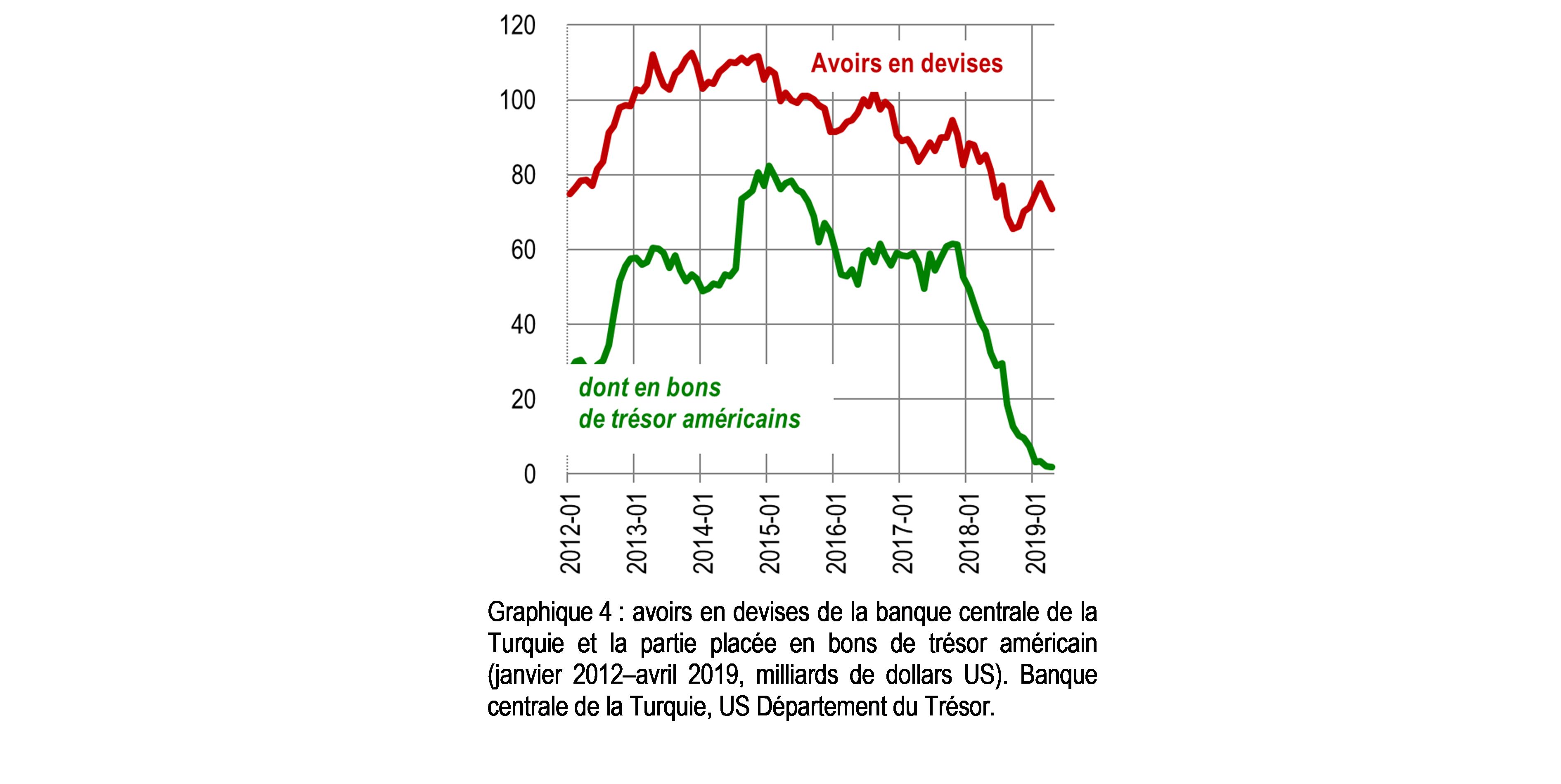 Graphique 4 : avoirs en devises de la banque centrale de la Turquie et la partie placée en bons de trésor américain (janvier 2012–avril 2019, milliards de dollars US)