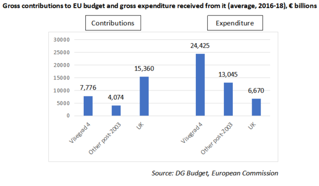 The arithmetic is striking: as can be seen from the chart below, the gross contributions (after allowing for the UK rebate) of the four Visegrad countries was roughly half that of the UK in the period 2016-18, and even adding all the other members states acceding after 2003, the revenue from all thirteen is well short of the UK gross contribution. The reverse is true for expenditure received.