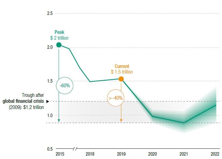 D’après la Conférence des Nations Unies pour le Développement (CNUCED) la chute des IDE devrait être encore plus profonde que celle du commerce. La CNUCED prévoit une réduction des IDE en 2020 de près de 40% par rapport à 2019, sans reprise dans l’année 2021 (graphique 2). Cette chute devrait être supérieure à celle qui a suivi la crise financière et économique de 2008-09.