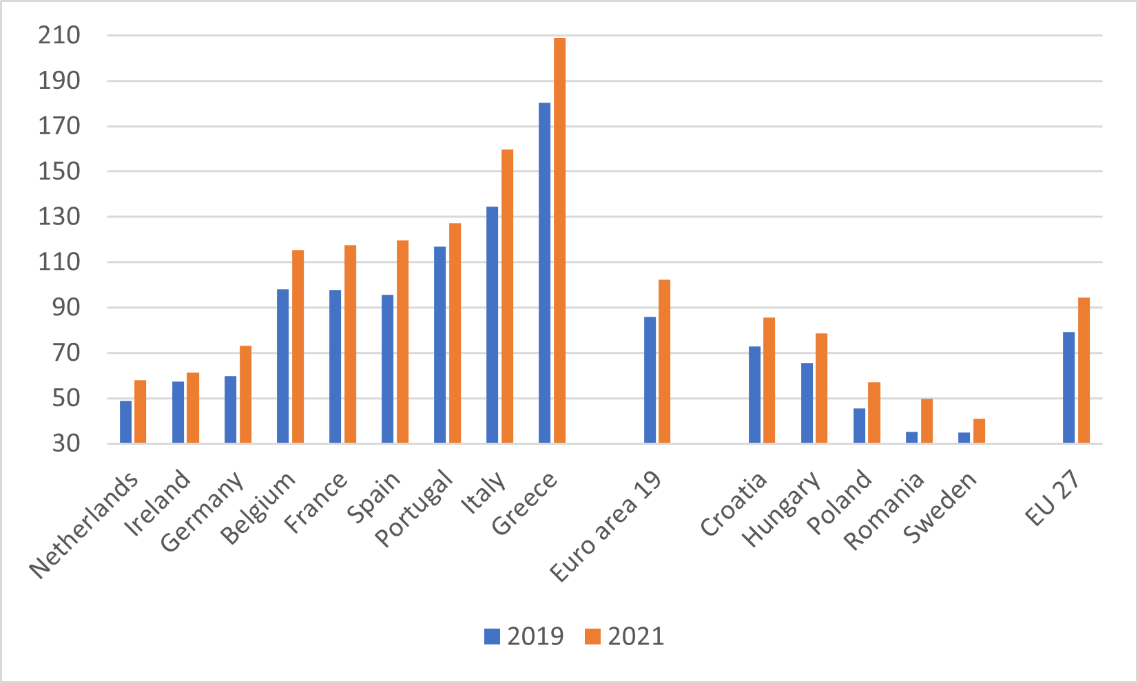 Gross public debt as a proportion of GDP, EU, euro area and selected member states, %